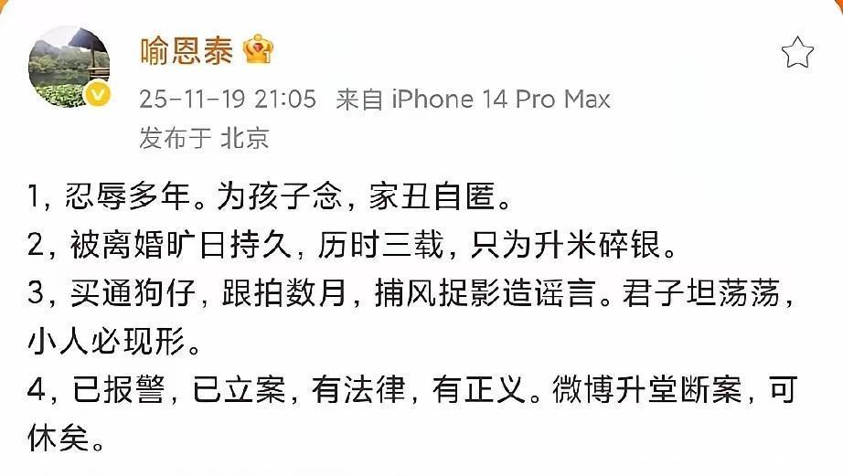 “为了孩子,家丑自匿,忍辱多年。”喻恩泰在文中直言,自己原本想为孩子保全完整的成长环境,默默承受婚姻破裂的苦果。可谁曾想,这场离婚竟成了对方拿捏自己的工具,长达三年的“被离婚”拉锯战,让他身心俱疲,而这一切的背后,只为“升米碎银”的利益纠葛。