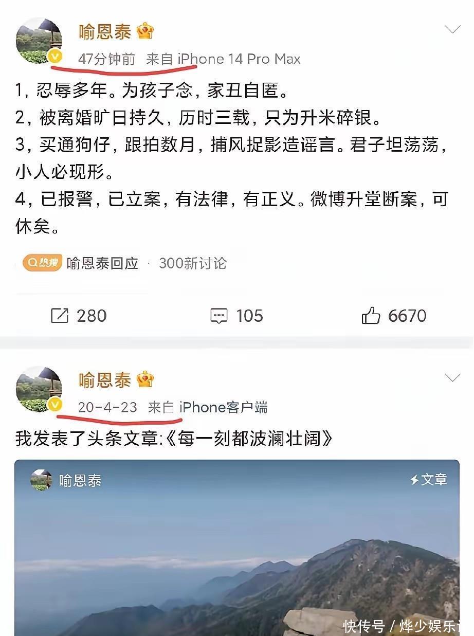 据悉,此前卓伟团队曾曝光喻恩泰与妻子史林子已分居2-3年,离婚诉讼已在北京第二次开庭,相关词条一度冲上热搜。而喻恩泰上一条社交媒体更新还停留在2020年4月23日,五年间零动态的他,显然是想用沉默守护家庭,却没能换来平静。
