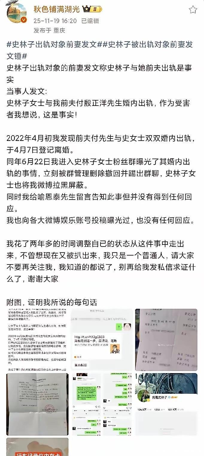 巧合的是,19日下午,史林子出轨对象的前妻也发文发声,虽未明指姓名,但内容与这场离婚风波高度关联,让本就复杂的局面更添迷雾。目前双方各执一词,一边是忍辱多年报警立案的喻恩泰,一边是有第三方前妻站台的史林子,真相到底藏在何处?